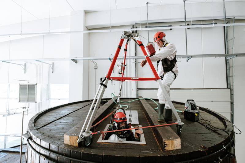 Trépied antichute pour espaces confinés, entièrement en aluminium et équipé de roues pour faciliter les déplacements.