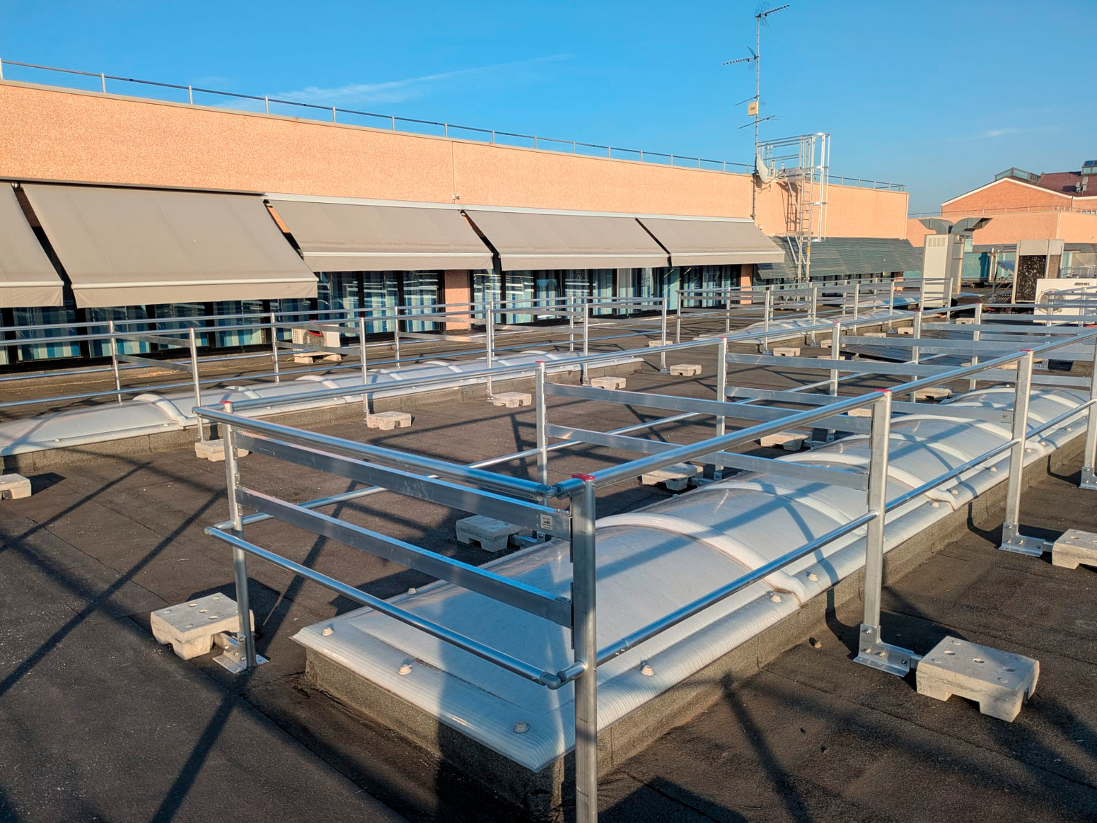 Il sistema di protezione collettiva ALU-GUARD permette l'installazione autoportante. E' ideale per tetti e superfici dove non è possibile praticare fori: si ancora tramite bracci orizzontali e zavorre in calcestruzzo, offrendo una protezione stabile senza interventi invasivi.