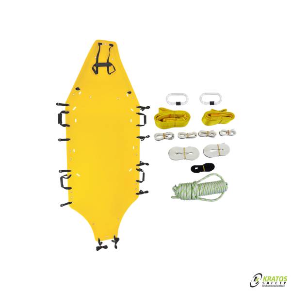 Camilla ligera de polipropileno amarillo con correas de poliamida, ideal para evacuaciones verticales y horizontales. Incluye dos conectores, correas adicionales, una cuerda de 9 m y una bolsa de transporte.