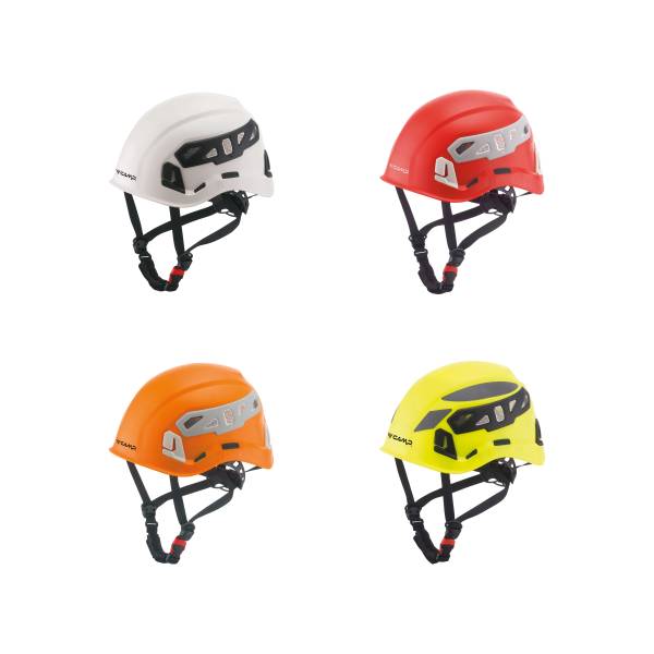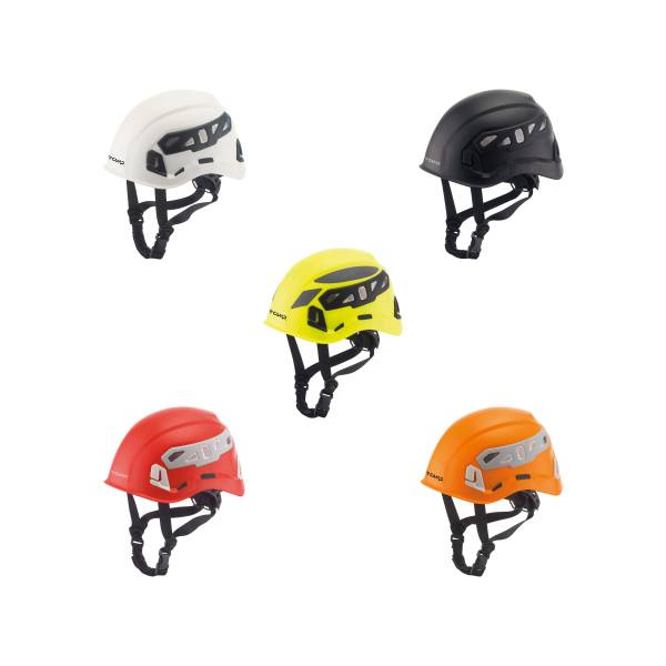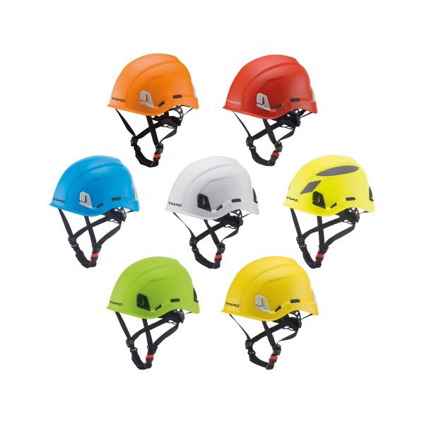 Casque qui intègre le confort, tant dans le travail au sol que celui en hauter, avec calotte robuste obtenue avec un mélange d'ABS et polycarbonate. Disponible en 7 couleurs : rouge, orange, bleu clair, vert, jaune, blanc et jaune fluorescent/gris.